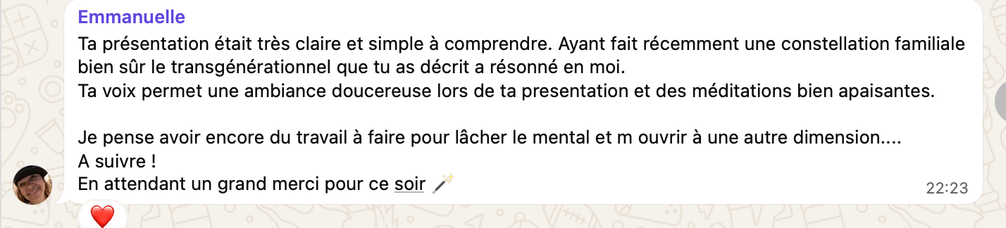 "La présentation était très claire et simple à comprendre. Ayant fait récemment une constellation familiale bien sûr le transgénérationnel que tu as décrit a résonné en moi.